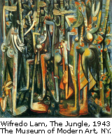 Although modernist in feel, Wifredo Lam's Jungle owes a greater debt to the Afro-Cuban beliefs in Santeria. Consequently, Jungle has much in common with the more intuitive spiritual expressions of Clarke, Brown and Duval-Carrie. Colour, overall patterning and an edgeless unified network of images reinforce the sense of integration in their work. Aside from visual similarities, a conceptual thread runs through all these works that is an underlying spiritualism and denial of western perceptions of the world.